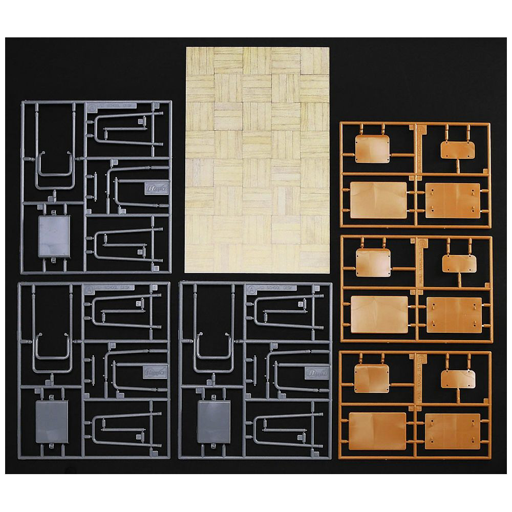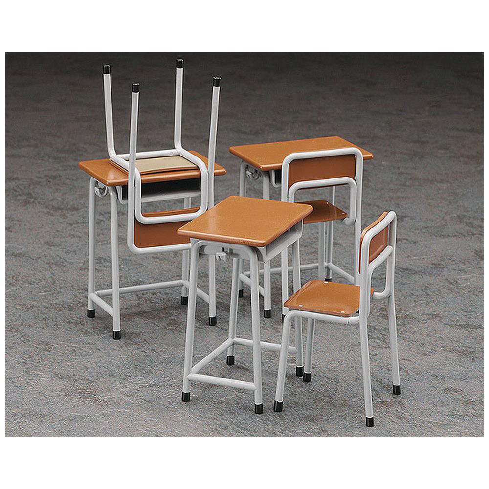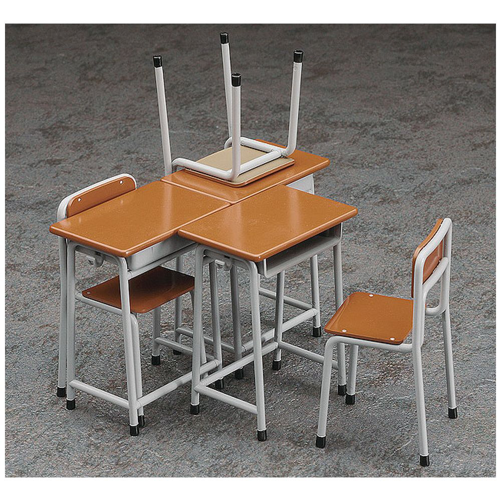 様々なアクションフィギュアとの組み合わせに最適!接着剤不要の1/12スケール組立キット。キャラ系フィギュアのプロポーションに合わせて、実際の寸法よりも腰高にアレンジした設計です。成形色はブラウンとグレーの2色。机×3、椅子×3のセットになります。