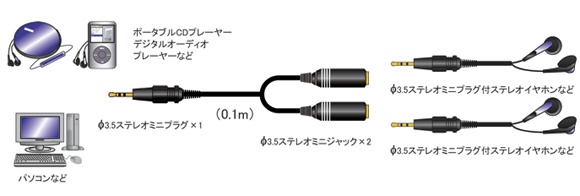 ステレオミニ端子を2分配します。