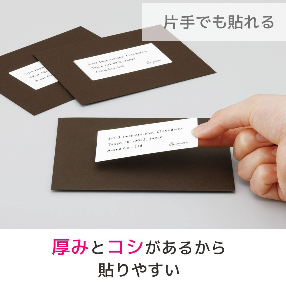 しっかりした厚みと印刷が映える高白色の上質紙を採用した、貼り心地の良いラベルです。いろいろなプリンタで印刷できます。また、いろいろな筆記具で書き込みもできるので手軽に使うことができます。そのまま使えるA4サイズの表示などに最適です。