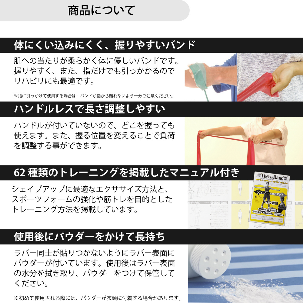 システム化された色別レジスタンス(抵抗力)世界59ヶ国で使用されている信頼のブランド!●伸縮自在医療リハビリ用にアメリカで開発されたセラバンドは、非常に高品質のラバーでできており、伸縮自在です。●手軽で簡単♪応用自在!利用者の体格に応じて、鍛えたい部位に応じて、自由な長さに切って使用することができます。いつでもどこでも手軽に使用することができます。●レベルに合わせて段階的にセラバンドは、強さに応じて8色(セラチューブは6色)に分かれていますので、レベルに合ったトレーニングを段階的に実戦することができます。●安全&低コスト筋力強化機器に比べて、筋肉に負担が少なく、インナーマッスルやアウターマッスルをバランスよく鍛えることができ、非常に低コストで効率的に運動できます。●各方面のプロ・リハビリの現場で支持!プロ野球選手をはじめ、トップアスリート・理学療法士や運動療法士の方々に強く支持されています。●APTA認定商品1920年に設立され、アメリカ国内のほどんどの理学療法士が会員になっている権威ある支援団体 America Physical Thearapy Association(米国理学療法士協会)であり、ほとんどの州で医師からの処方を受けたリハビリを依頼されています。また、国や政府とのつながりのある協会でもあります。3段階の厳格な審査をパスしたセラバンドは、バンド・チューブの最初のブランドであった事実と、セラピストの運動療法の実践の場と教育の現場でセラバンドの色別レジスタンスが用いられていることが評価されました。