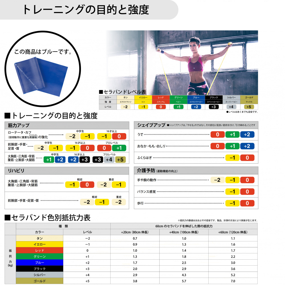 システム化された色別レジスタンス(抵抗力)世界59ヶ国で使用されている信頼のブランド!●伸縮自在医療リハビリ用にアメリカで開発されたセラバンドは、非常に高品質のラバーでできており、伸縮自在です。●手軽で簡単♪応用自在!利用者の体格に応じて、鍛えたい部位に応じて、自由な長さに切って使用することができます。いつでもどこでも手軽に使用することができます。●レベルに合わせて段階的にセラバンドは、強さに応じて8色(セラチューブは6色)に分かれていますので、レベルに合ったトレーニングを段階的に実戦することができます。●安全&低コスト筋力強化機器に比べて、筋肉に負担が少なく、インナーマッスルやアウターマッスルをバランスよく鍛えることができ、非常に低コストで効率的に運動できます。●各方面のプロ・リハビリの現場で支持!プロ野球選手をはじめ、トップアスリート・理学療法士や運動療法士の方々に強く支持されています。●APTA認定商品1920年に設立され、アメリカ国内のほどんどの理学療法士が会員になっている権威ある支援団体 America Physical Thearapy Association(米国理学療法士協会)であり、ほとんどの州で医師からの処方を受けたリハビリを依頼されています。また、国や政府とのつながりのある協会でもあります。3段階の厳格な審査をパスしたセラバンドは、バンド・チューブの最初のブランドであった事実と、セラピストの運動療法の実践の場と教育の現場でセラバンドの色別レジスタンスが用いられていることが評価されました。