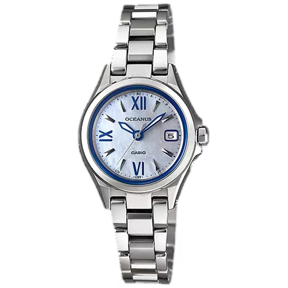 シンプルで利便性の高いデイト付3針モデルで、ケース直径30.3mm、厚さは8.6mm、重さ31gと女性が使いやすい小型・軽量サイズに仕上げました。また秒針位置自動補正機能により、万が一の針ずれにも対応。毎日安心して使用することができます。風防には無反射コートを施したデュアルカーブサファイアガラスを採用し、美しさと見やすさを両立。7AJFには文字板に白蝶貝を採用し、より美しさを際立たせています。ベゼルの内側や時字にはブランドカラーであるオシアナスブルーをあしらいました。大人の女性に向けた上質さと実用性を併せ持つOCEANUSの登場です。・ 電波受信機能:日本2局、中国・ 秒針位置自動補正機能※・ タフソーラー・ チタンケース、バンド※ 秒針位置自動補正機能秒針の位置を毎分検知し確認。LSI 内の時刻カウンターと針の基準位置が万一ずれてしまった場合に、針を正しい位置に自動補正します。■ OCEANUS(オシアナス): 海を支配する神(ギリシャ神名:オケアノス)に由来。*ケースサイズはりゅうずを含みません。