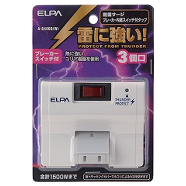 A-S400B-W 耐雷サージ ブレーカー内蔵スイッチ付タップ(3個口)