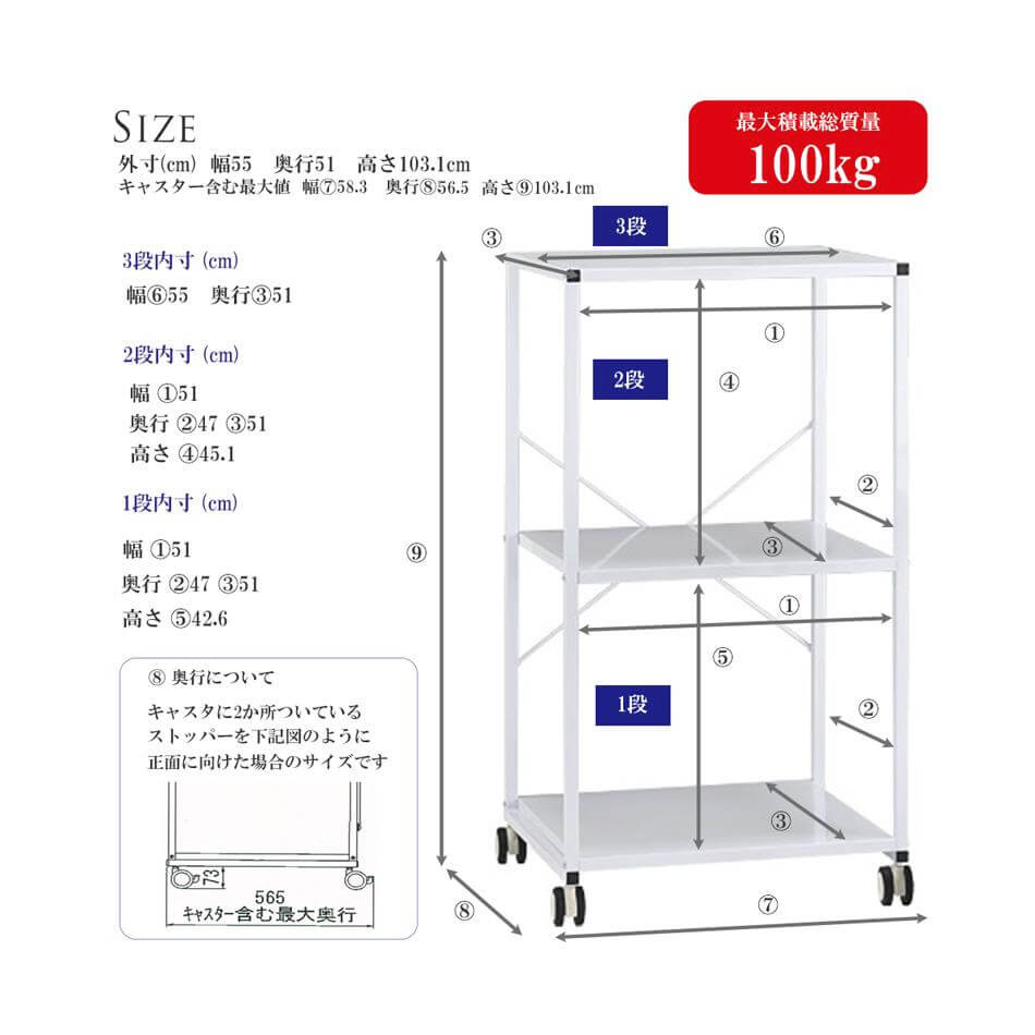 耐荷重は総重量で100kgまでOK!レーザープリンターや予備の用紙を置くことができます。キャスター付(2か所ストッパー付き)で移動もらくらく。シンプルなので、本やファイルを置く普通のラックとしても活用できます。