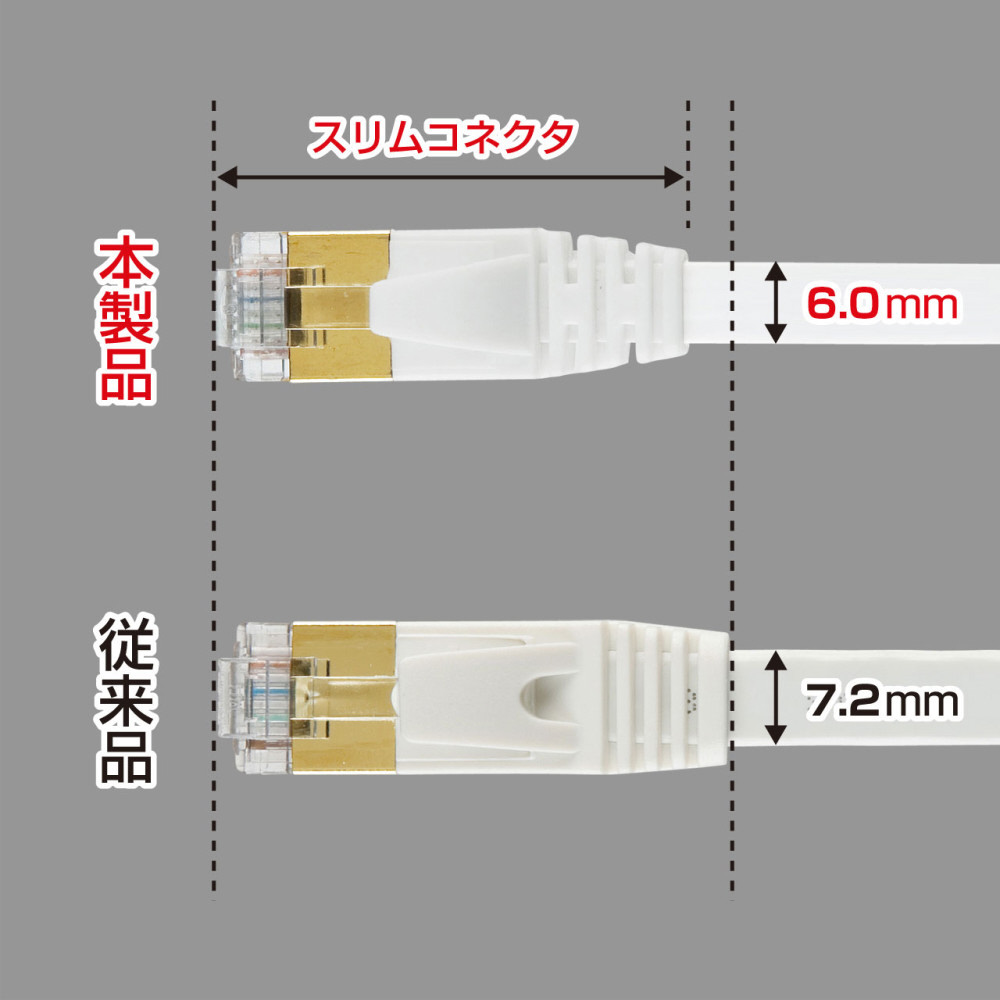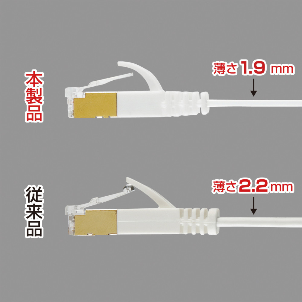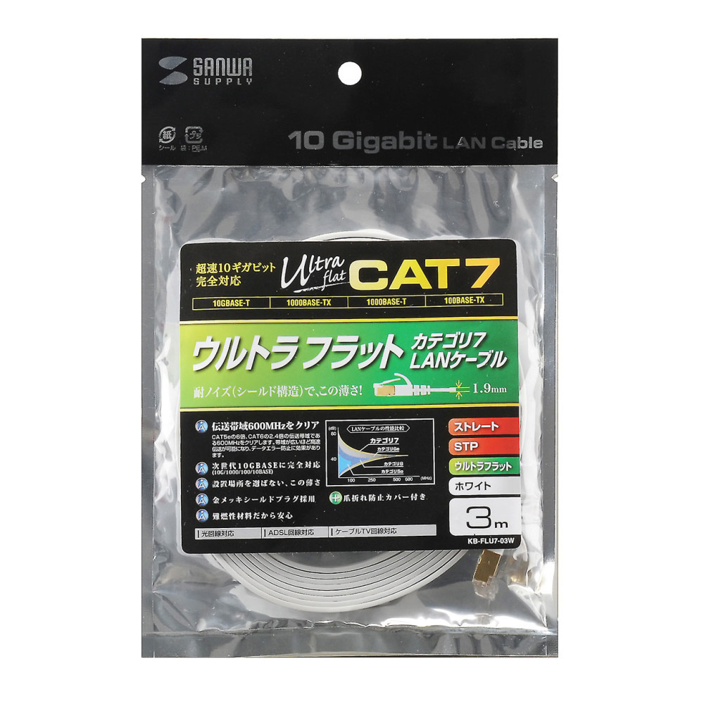 10GBASE完全対応。耐ノイズで1.9mmの薄さを実現したカテゴリ7対応のウルトラフラットLANケーブル。3m・ホワイト。