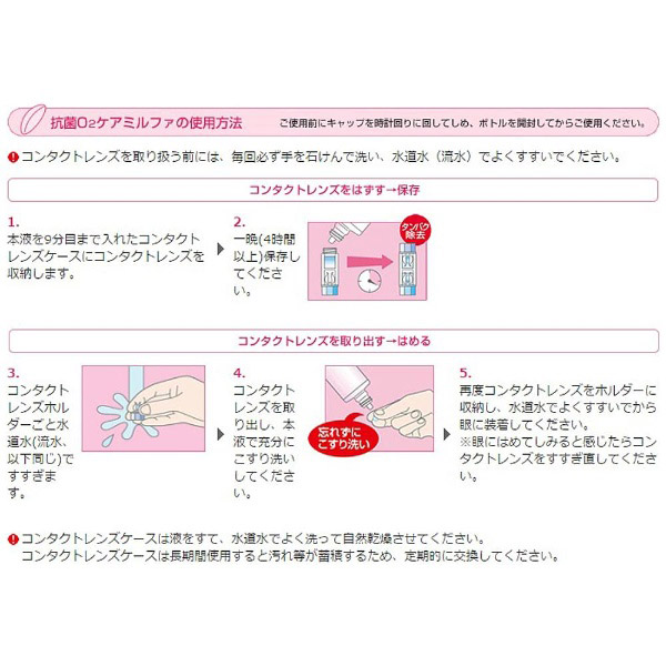 眼の病気の1つ「角膜感染症」の原因となる雑菌を眼に持ち込まないよう、コンタクトレンズを保存する保存液やコンタクトレンズケースは清潔に保ちたいものです。「抗菌O2ケアミルファ」は保存液中の菌の増殖を防ぐので、より清潔にコンタクトレンズをお使いいただけます。