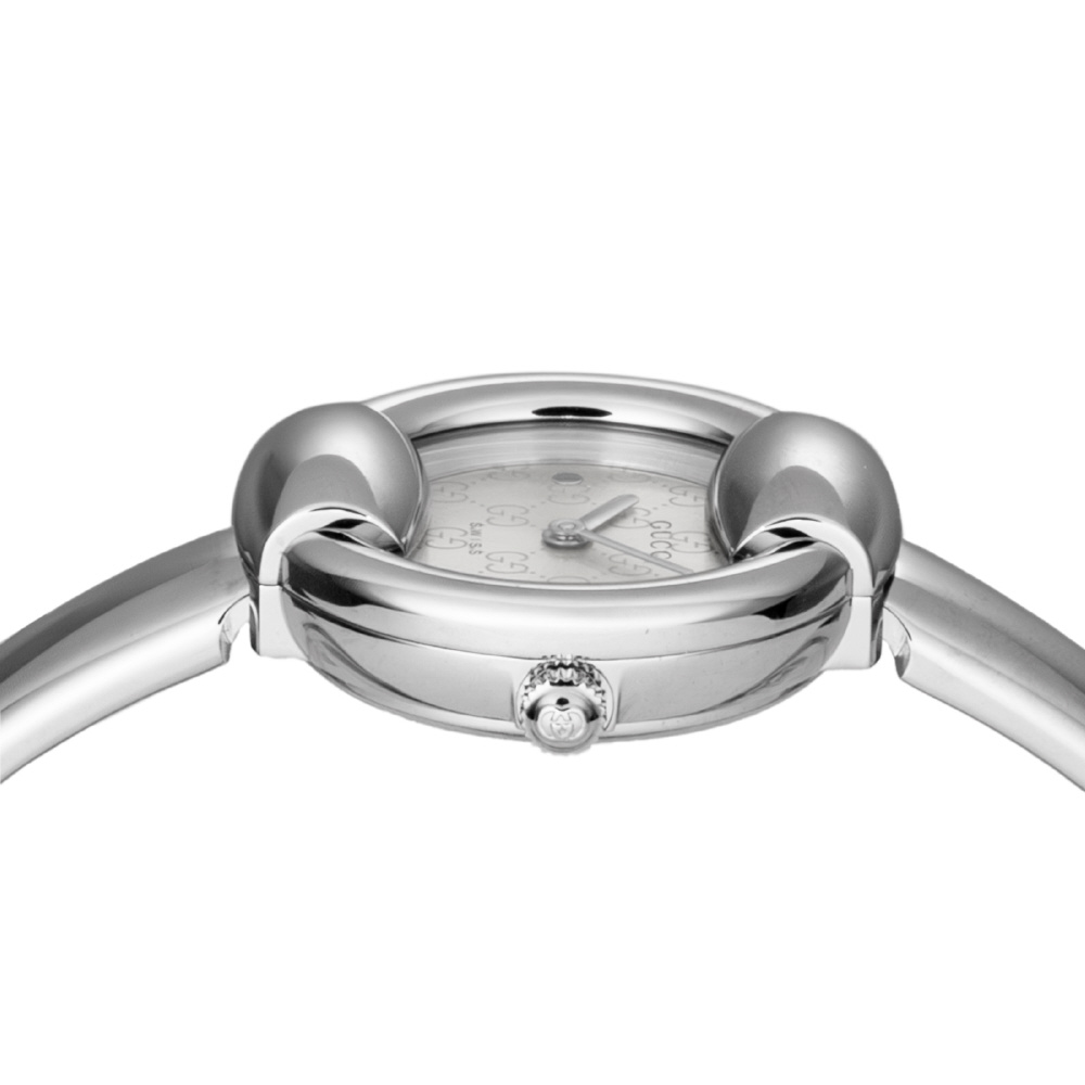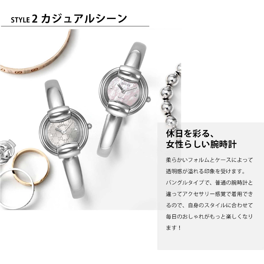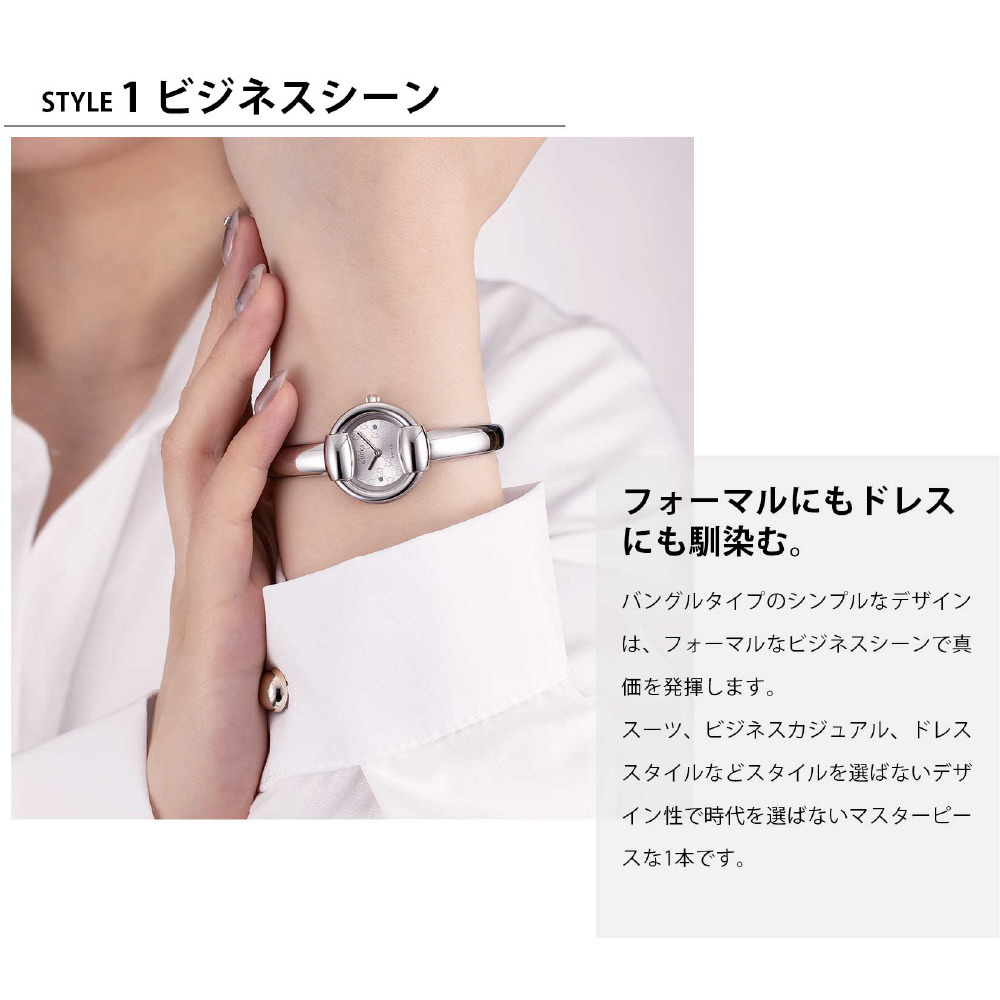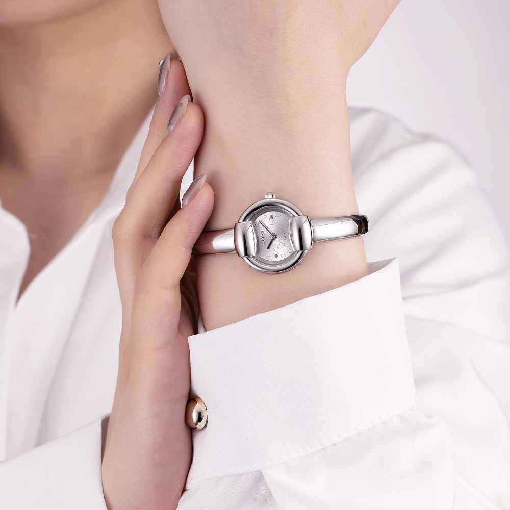 オールシルバーのラウンドケースをバングルがつかみ、滑らかな曲線が女性らしくスタイリッシュで品を放つフェイスがクールビューティなウォッチです。