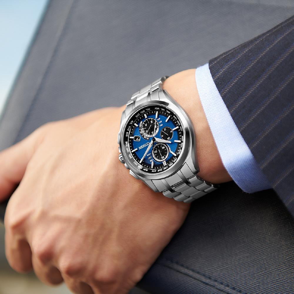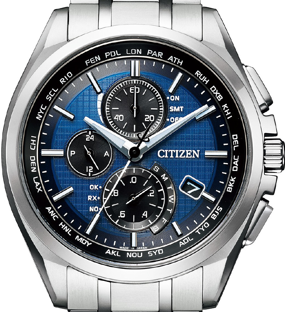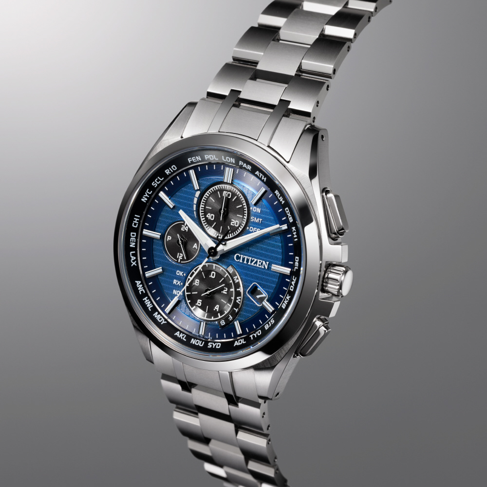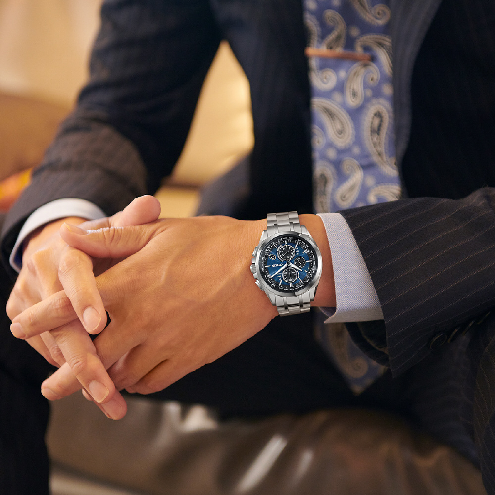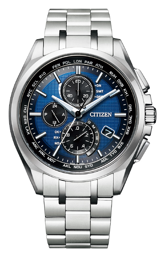 ■スリムボディ 多機能でありながら9.72mm(設計値)という薄さを実現。サイドから見ても無駄のないソリッドなデザインとなっています。■針表示式ダイレクトライト 繊細な美しさを兼ね備える針表示式は、見返しリングに並ぶ都市名に秒針を合わせると、即座にその都市の時刻を表示します。■文字板 シンプルな色調でまとめ、情報を整理して配置。細身の夜光処理を施した小秒針など、細部まで見やすさを追求しています。■クロノグラフ 縦三つ目のレイアウトによって、全体汚スリムな印象を強調。秒針がクロノ針とダイレクトフライトの都市選択の針を兼用しています。