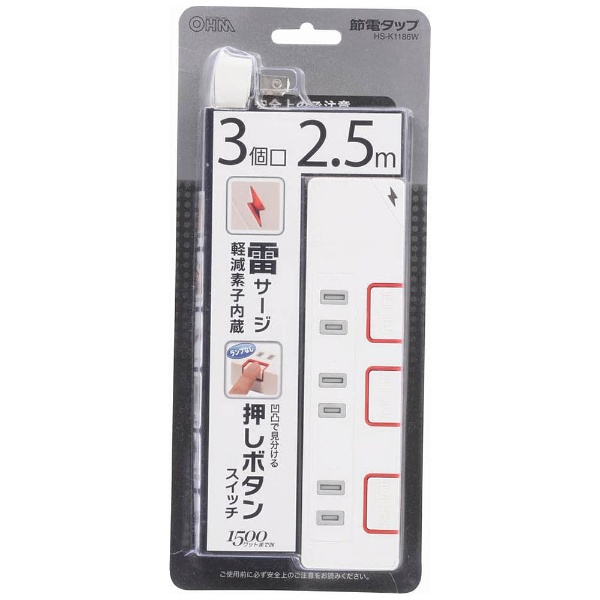 プッシュスイッチ式節電タップ (3個口・2.5m・ホワイト) HST1186W [OAタップ] 【864】