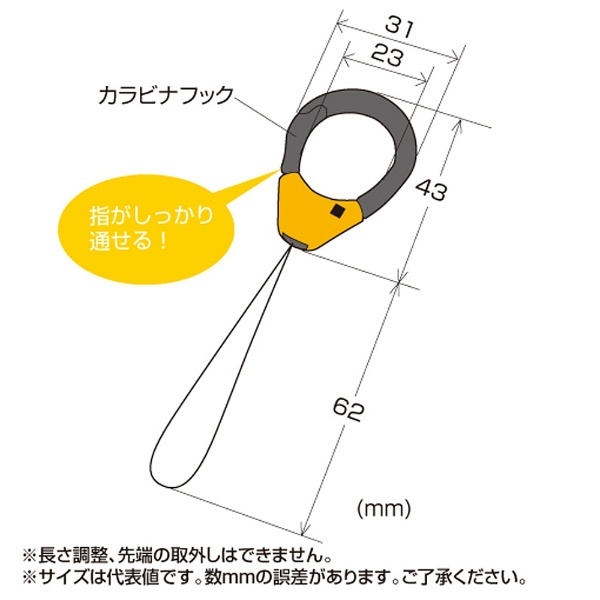 ■ スマートフォンやデジカメなどにおすすめです。指をひっかけてポケットやバッグなどから取り出しやすく、便利です。