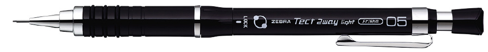 フリシャ機能切換付きシャープ。フリシャ機能ON→軸中央を右へ回すと振るだけで芯が出る。フリシャ機能OFF→軸中央を左へ回すと軸内部の重りが固定され、低重心で安定筆記。(振っても芯が出ないので、通常のシャープ同様、ノックして使用)製図用ペン先。手元がよく見える、視界の広い長めの極細先端パイプ。