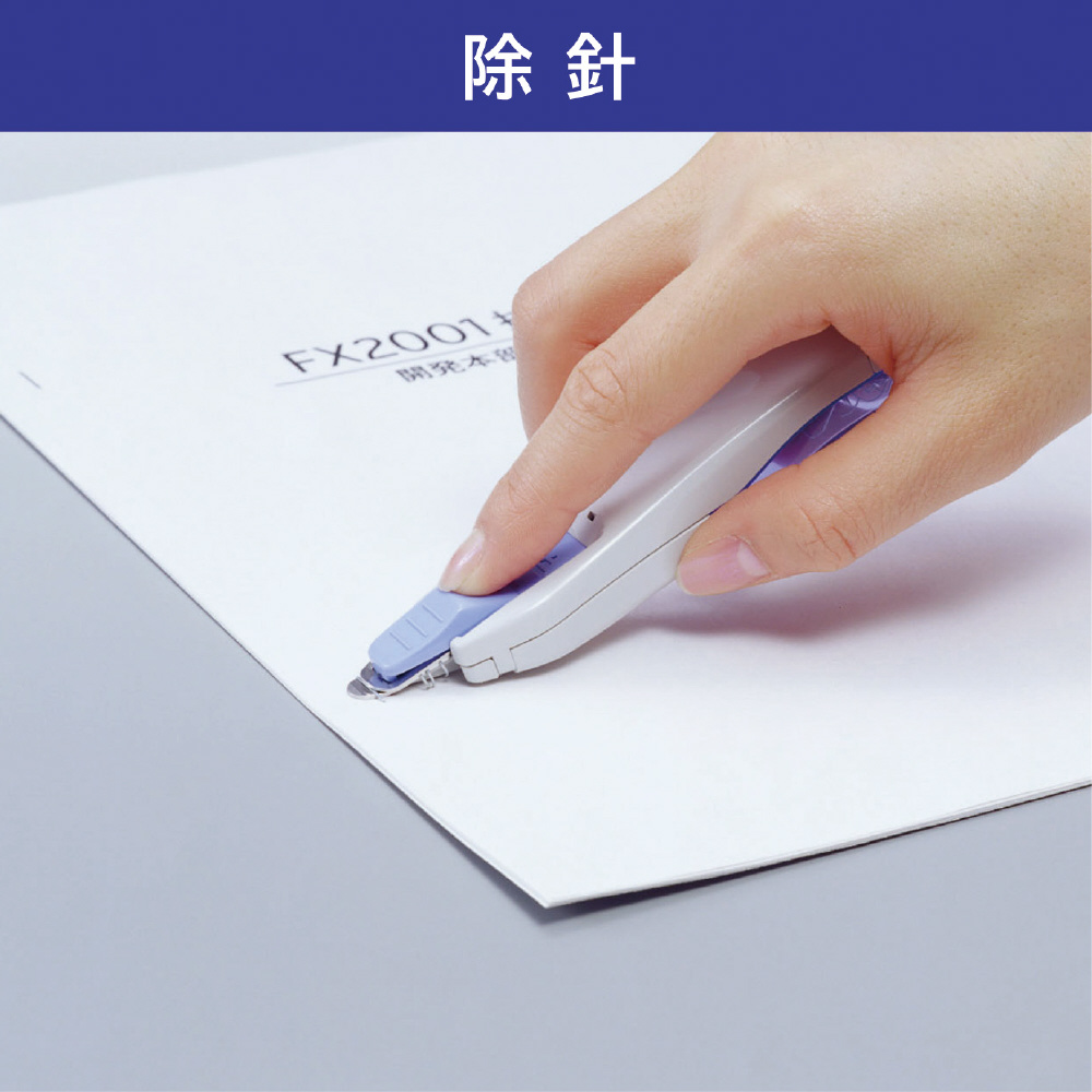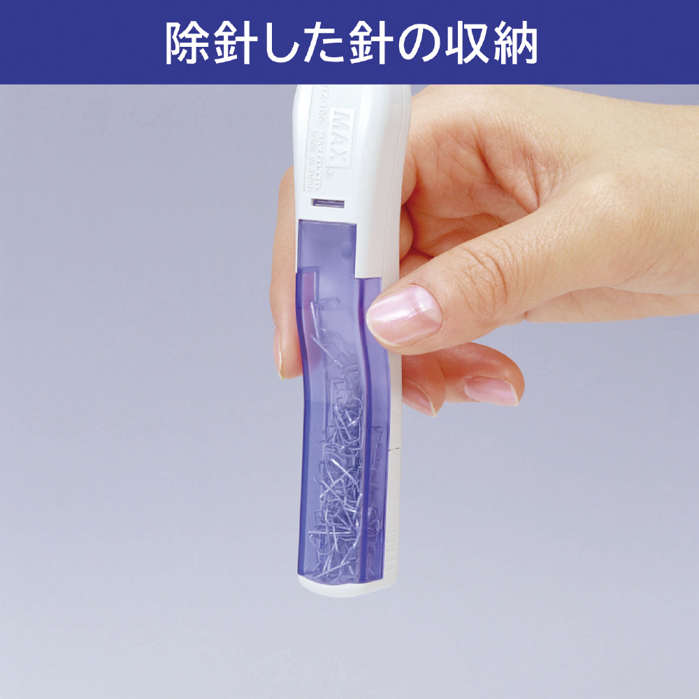 先端で除針した針をそのままリムーバ本体に収納。マグネット内蔵で、針が飛び散りません。