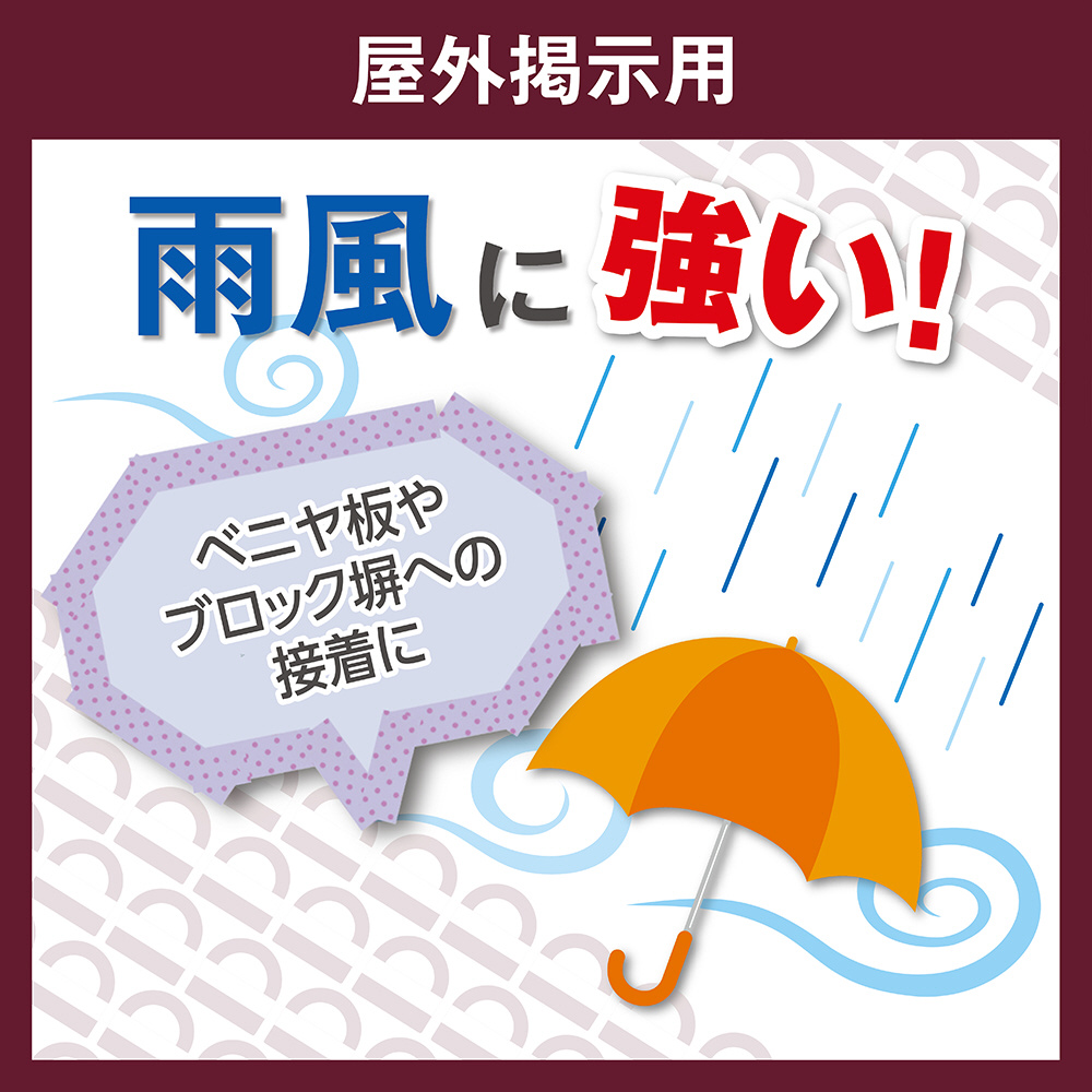 ベニヤ板やブロック塀など、屋外専用の両面テープです。風雨に強く凹凸面にもよく付きます。