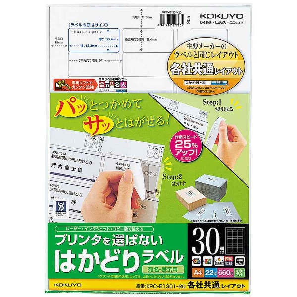 プリンタを選ばない はかどりラベル 121g/m2 (A4サイズ:30面・22シート:660片) KPC-E1301-20