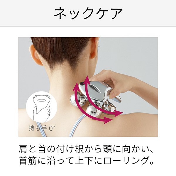プロの手技を複合的に再現するため、「つまみ流す」「つかみ絞る」というスパイラルニーディングを再現しました。複雑な身体のラインを縦横無尽に動かすことができ、これまでになかった肌の引き締まりを実現します。