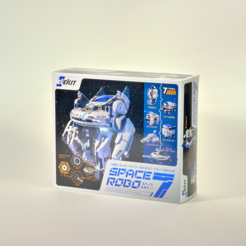 太陽の光で発電した電気をミニ充電池にため、その電気をエネルギーにかえて動くロボットです。 部品の組みかえで宇宙飛行士やスペースシャトル、スペースロボなど7通りの工作を楽しめます。