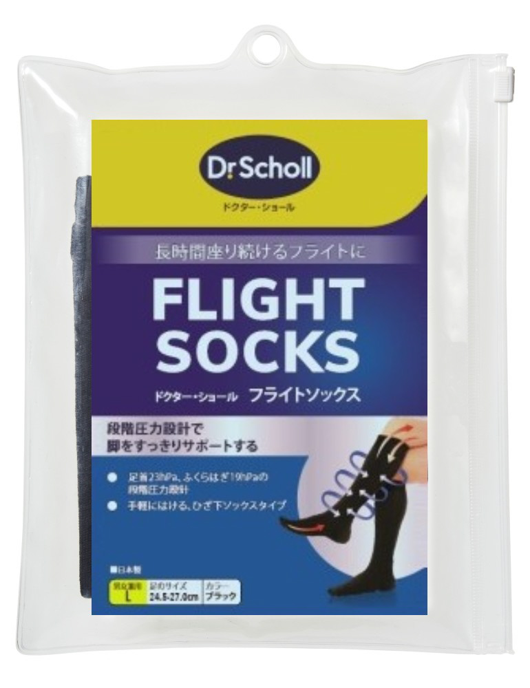 ・飛行機での旅行は、長い時間動かないままの姿勢でいたり、水分の摂取不足などになりやすいといわれています。ドクター・ショールは長時間のフライトの対策として、段階圧力設計ソックスの着用をおすすめします。