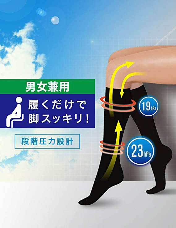 ・英国の圧力値標準規格をもとに、足に効果的な段階圧力値を採用。足首23hPa、ふくらはぎ19hPaと徐々に圧力値を低くすることで、飛行機内で脚をすっきりサポートします。※hPa(ヘクトパスカル)は、圧力を表す国際単位です。