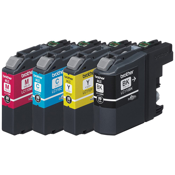| 仕様1 | インクジェット複合機用のインクカートリッジ LC110-4PKです。 LC110BK(ブラック)、LC110C(シアン)、LC110M(マゼンタ)、LC110Y(イエロー)4色各1本がセットになった4色パックです。 |