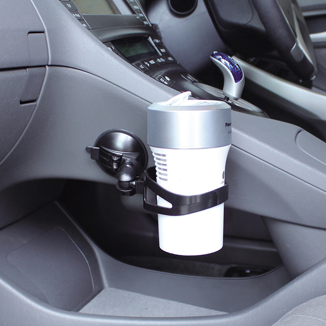 車内空間の最適な場所に空気清浄機を取り付け可能。ボールジョイント構造によりお好みの角度に調整可能。吸盤の脱着はレバー操作で簡単。