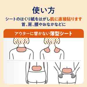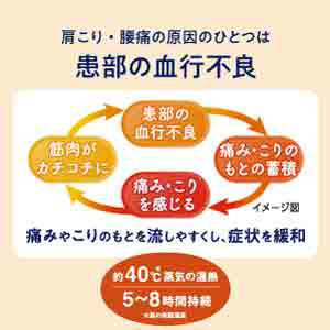 首や肩、腰、おなかに直接貼り、温める医療機器。心地よい蒸気の温熱で、じんわり深く温めて患部の血のめぐりをよくし、慢性の肩こり・腰痛をじっくりほぐします。●快適温度約40℃が5〜8時間続きます●肌あたりがやさしい適度な蒸気。衣類はぬらしません。●ニオイがないので外出時でも使いやすい。●おなかにあてると、胃腸の働きを活発にします。●効能効果:温熱効果●一般医療機器