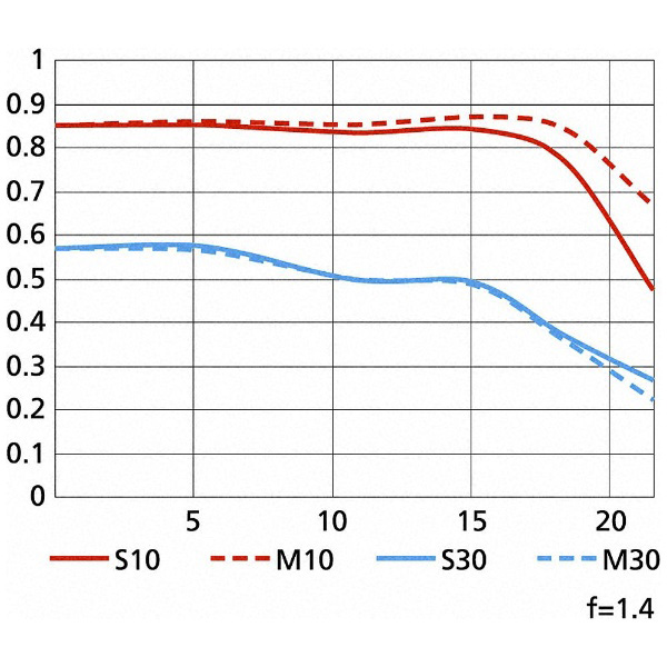 周辺光量が低下しやすい大口径レンズでありながら、f/1.4の開放絞りで、最も低下する無限遠でも豊富な周辺光量を確保しています。点光源が点に写る描写特性を活かしながら夕景をより速いシャッタースピードでシャープに捉えたい時でも、周辺光量不足を気にすることなく、開放絞りで安心して撮影に集中できます。