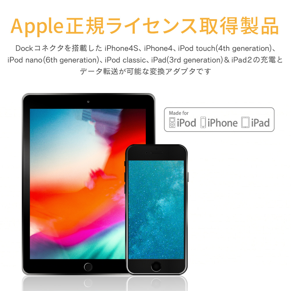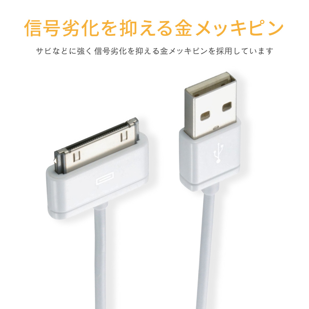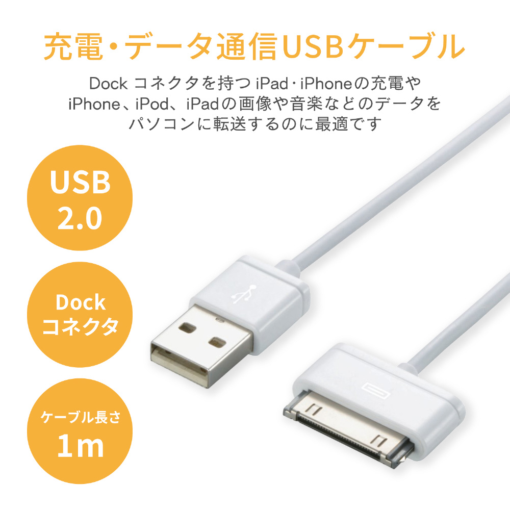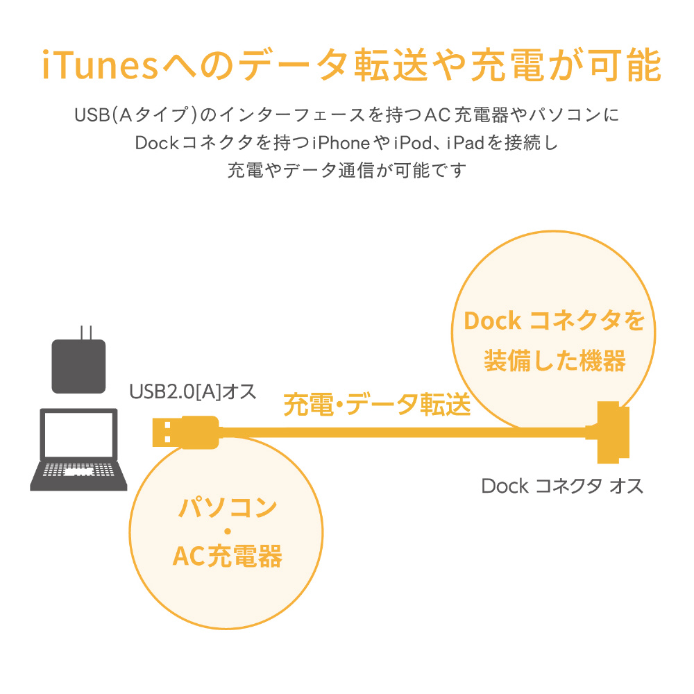 Dockコネクタを持つiPad・iPhoneの充電・データ通信に最適。DockコネクタとパソコンやAC充電器のUSBポートを接続して充電・データ通信ができるUSBケーブル。
