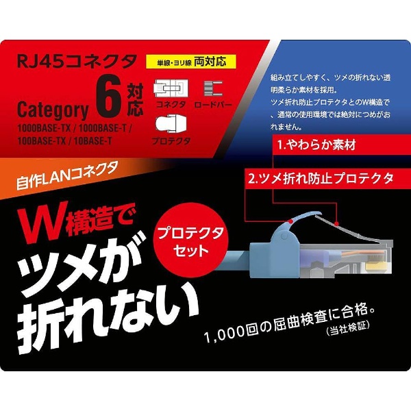 プロテクタと新素材コネクタ採用のダブル構造で、通常の使用環境では絶対にツメが折れず、ケーブルの引っかかりを防ぐ保護カバーがセットになった、LANケーブル自作用RJ45コネクタ。