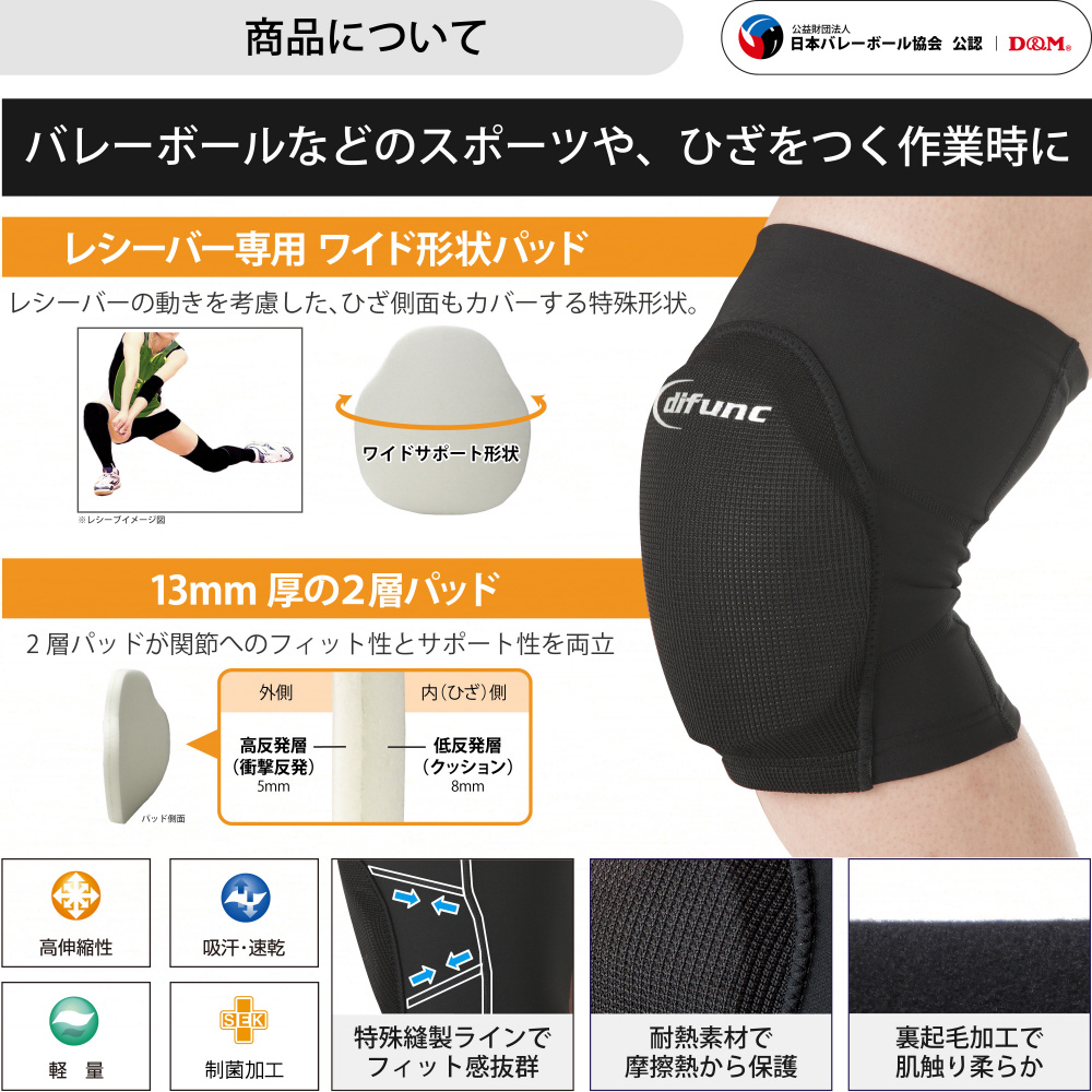 ワイドパッドでひざ頭周囲まで保護!ママさんバレーボール専用サポーター。