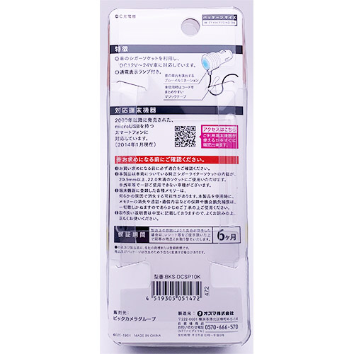 | 商品名 | 【在庫限り】 スマートフォン用[micro USB] DC充電器 (1m・ブラック) BKS-DCSP10K 【ビックカメラグループオリジナル】 |
