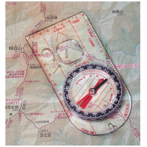 オリエンテーリングコンパスとは透過性のいい透明なプレートと透明なコンパスで地図の上でも鮮明に地図が読め、角度を出すことができます。偏差修正目盛りと側面のスケールで磁北線も簡単にひくことができます。強磁性体の特殊鋼を使用、指針の先端磁力は250Ga(ガウス)、速くスムーズな動きをします。人工石軸受を使用、摩擦抵抗が小さいので方位誤差のない敏感なコンパスです。
