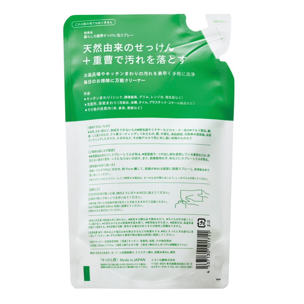 暮らしの重曹せっけん泡スプレー つめかえ用 (230ml)〔キッチン用洗剤〕