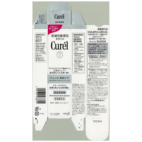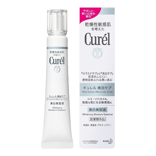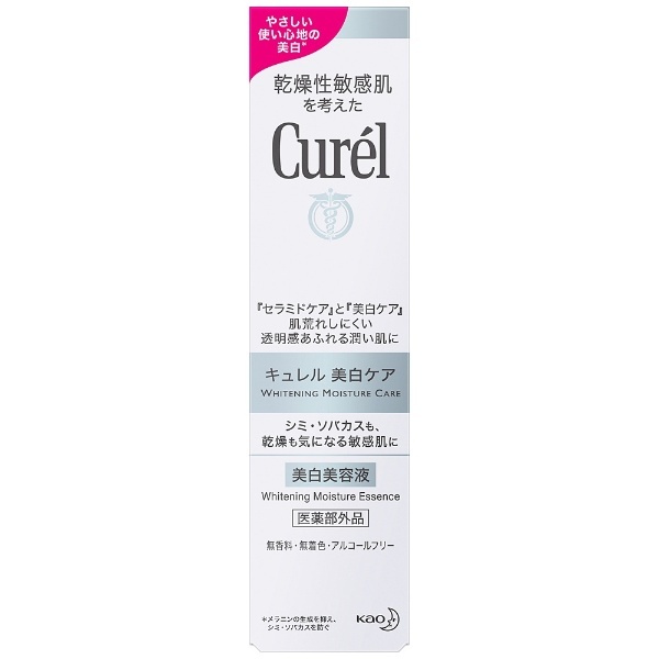 ○乾燥性敏感肌を考えた低刺激性の美白美容液。○高浸透性処方(*キュレル美白乳液比)○美白有効成分(カモミラET)配合。メラニンの生成を抑えて、シミ・ソバカスを防ぎます。○潤い成分(ユーカリエキス)配合。外部刺激を受けにくい、なめらかで潤いに満ちた肌に保ちます。○肌に溶けこむようになじみ、潤い続く使い心地。○無香料・無着色・アルコールフリー(エチルアルコール無添加)(医薬部外品)