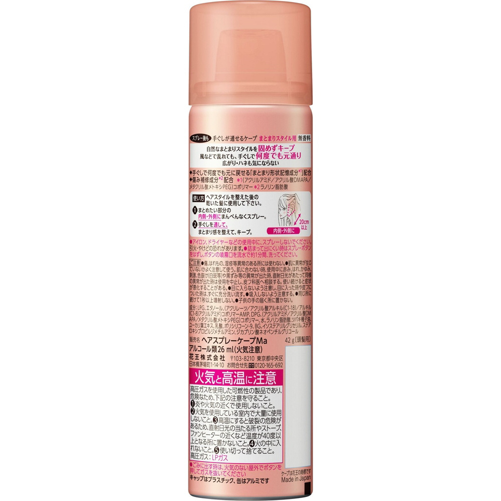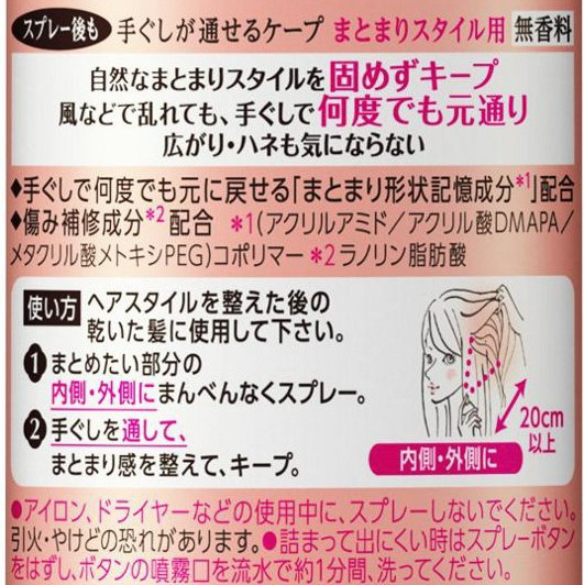 自然なまとまりスタイルを固めずキープ。風などで乱れても、手ぐしで何度でも元通り。広がり・ハネも気にならない。◆手ぐしで何度でも元に戻せる「まとまり形状記憶成分*1」配合 *1(アクリルアミド/アクリル酸DMAPA/メタクリル酸メトキシPEG)コポリマー◆傷み補修成分*2配合 *2ラノリン脂肪酸◆無香料
