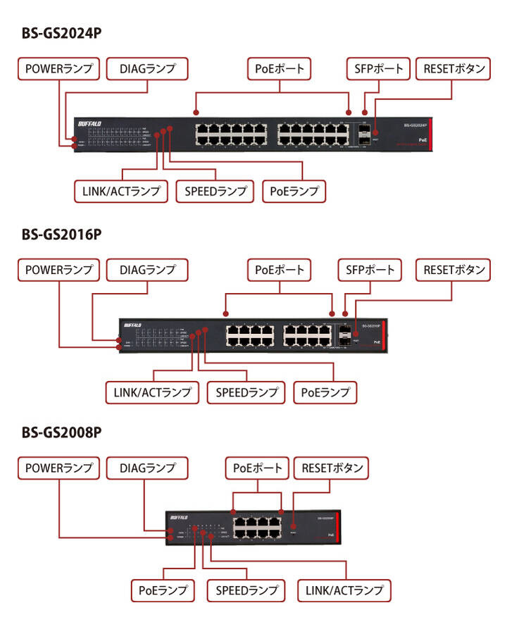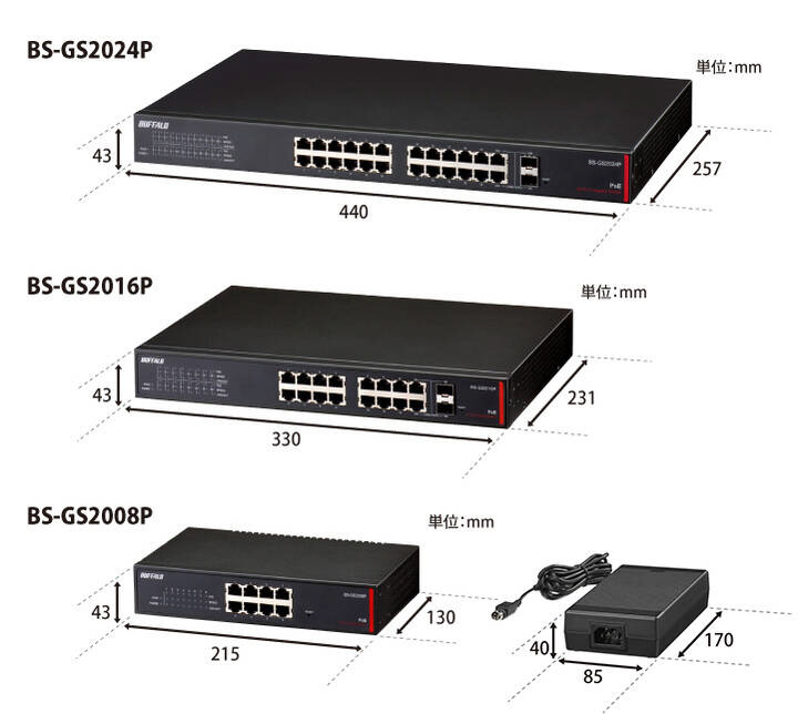 IEEE802.11nや11ac無線LANの性能を最大限に生かし、設置費用の大幅な削減を可能とするPoE給電Gigaスイッチです。IEEE 802.3at規格(PoE+)に対応し、装置全体で最大90W(※)の給電能力を実現。高出力給電が必要なネットワークカメラや無線アクセスポイントの複数台接続にも給電可能で、PoEスイッチから電源管理が可能になります。
