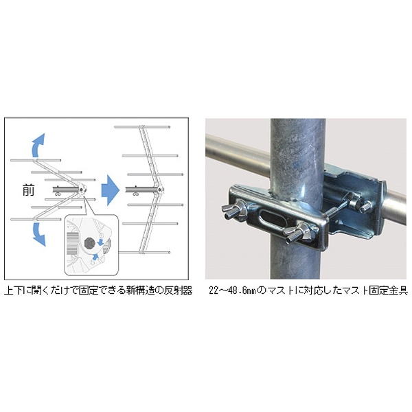 ・上下に開くだけで固定できる新構造の反射器や、F型コネクターを採用した新設計のビームダイポールにより、組立てやすく、設置時間を短縮できます。また、適合マスト径が22〜48.6mmと共同受信用のマストにも対応していますから、設置場所を選びません。