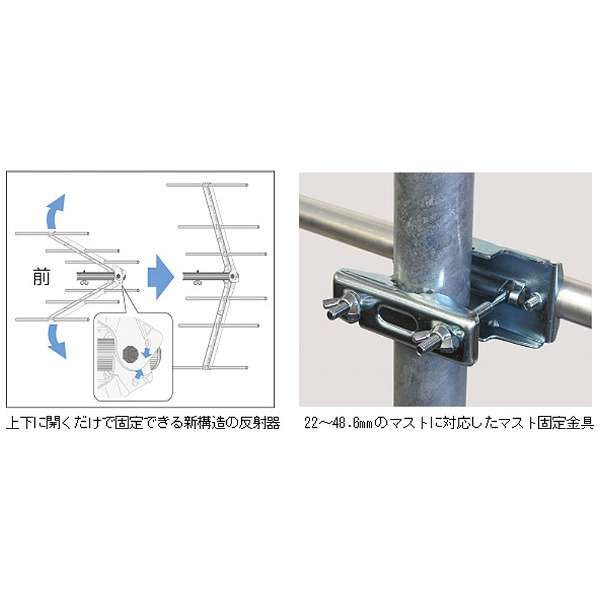 ・上下に開くだけで固定できる新構造の反射器や、F型コネクターを採用した新設計のビームダイポールにより、組立てやすく、設置時間を短縮できます。また、適合マスト径が22〜48.6mmと共同受信用のマストにも対応していますから、設置場所を選びません。