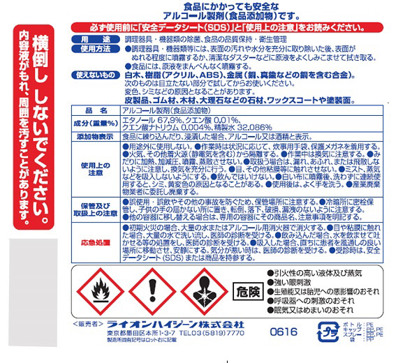| 成分 | エタノール濃度:67.9重量%、約75容量%(vol%) |
