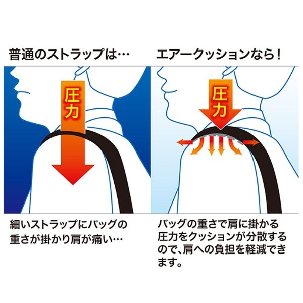〔肩にやさしいエアークッション内蔵ショルダーベルト。カーブタイプ。〕