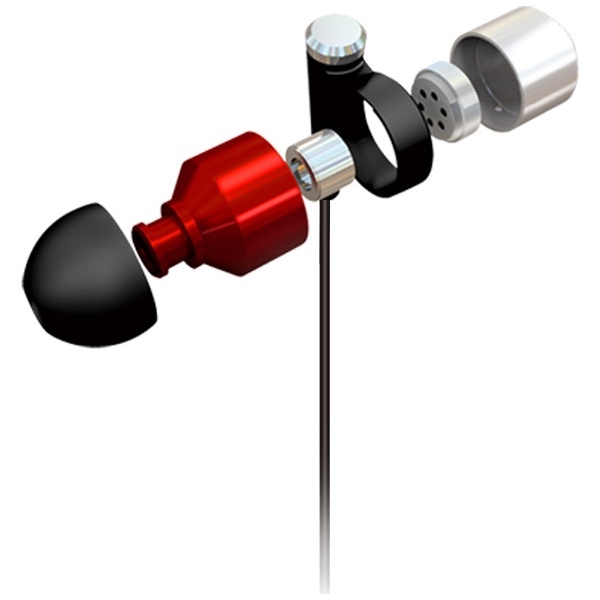 アルミの削り出しによる硬質ボディーの内部に、材質や硬度に吟味を重ねたハウジング、ユニットホルダーを組み込むことにより、音に悪影響を与える不要な振動が抑制され、タンデムマウントされたデュアル・ダイナミック・スピーカーの性能を最大限に発揮させることができます。また、本体フロント部の右(R)側には艶やかなルビーレッドを、左(L)側には落ち着いた艶消しブラックを配色することにより、視認性を向上させ、本体リア部のダーククロームとのコントラストによる高級感も演出しています。