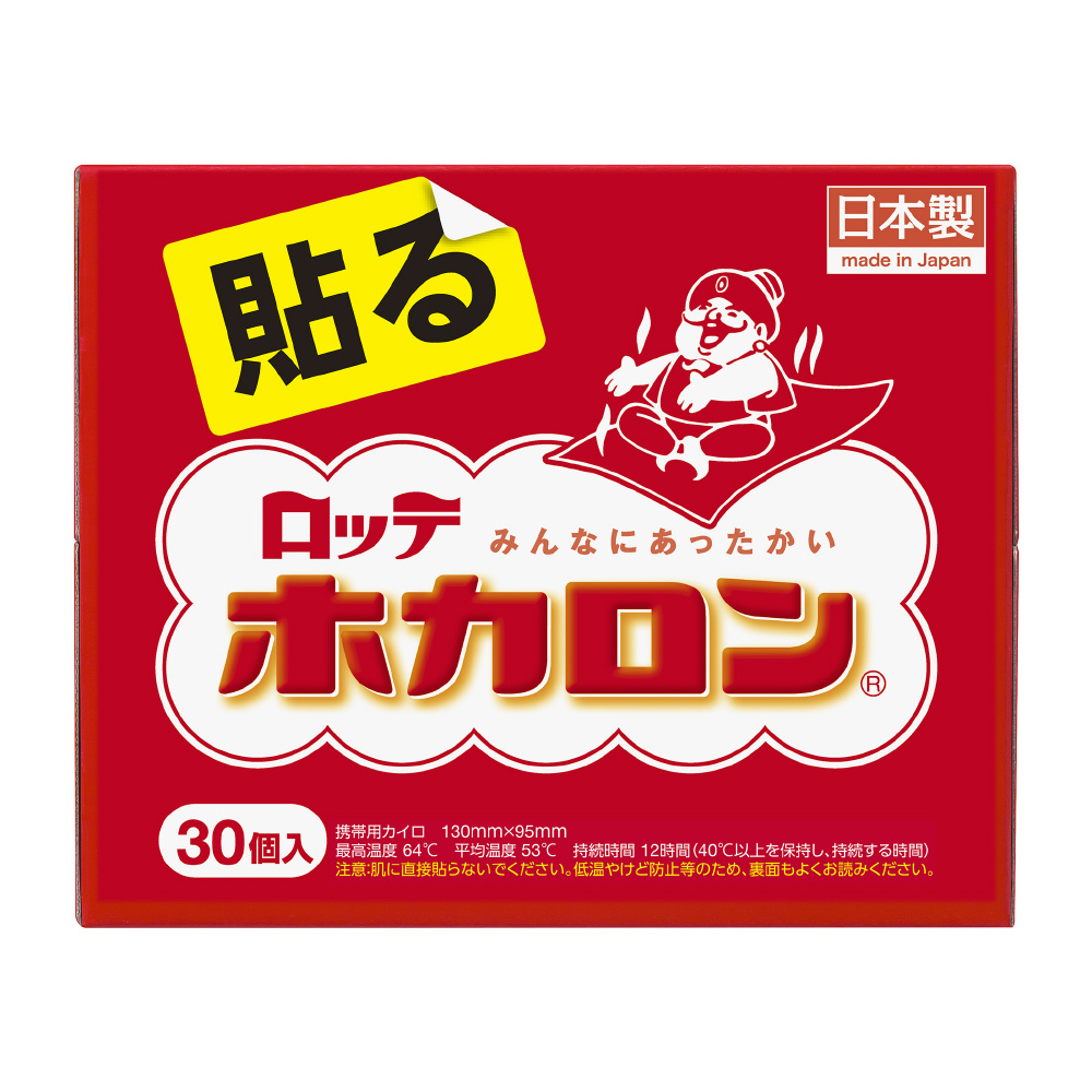 衣類の上から貼ってズレない「ホカロン」。店頭アイキャッチ力抜群の赤いパッケージです。ホカロンは、携帯カイロのパイオニア、定番的、親しみやすいといったイメージで消費者の指示を頂いているブランドです。