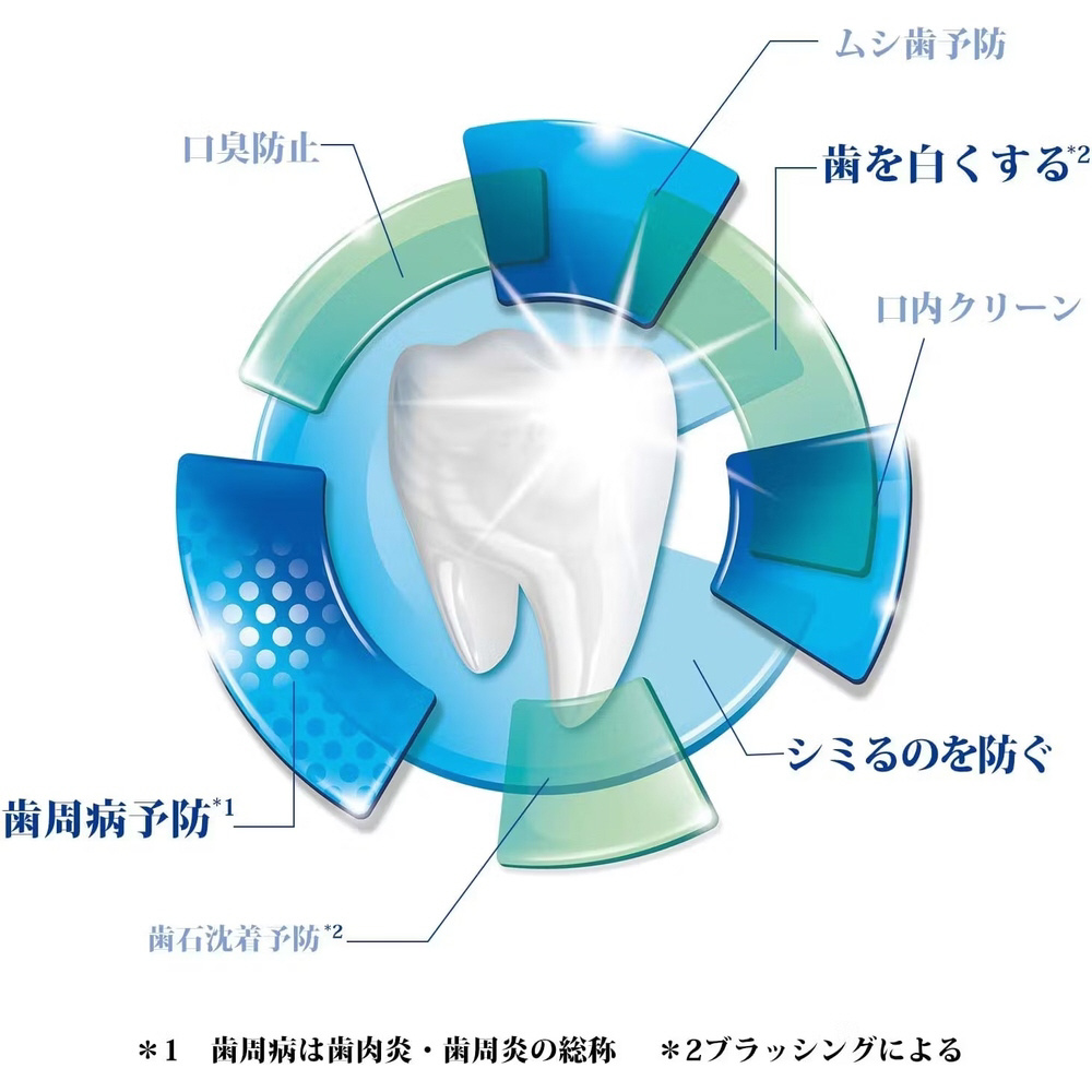 知覚過敏ケアを考えて特別に開発されたハミガキ。7つの働き(シミるのを防ぐ、歯周病予防、歯を白くする、ムシ歯予防、口臭防止、口中クリーン、歯石沈着予防)がひとつに。効能効果は歯がしみるのを防ぐ。歯周炎の予防。歯肉炎の予防。むし歯の発生および進行の予防。口臭の防止。歯を白くする。口中を浄化する。口中を爽快にする。