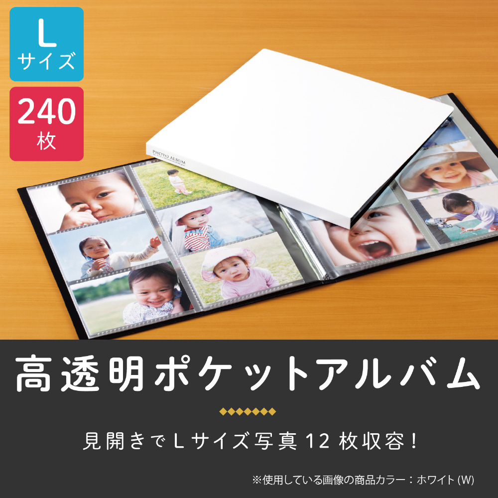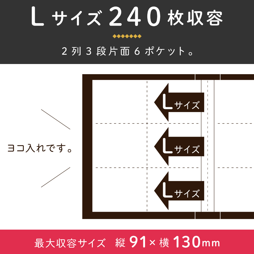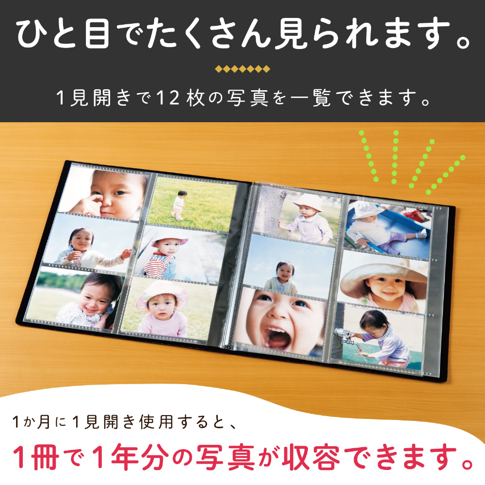 L判写真が見開きで12枚収容できる高透明ポケット採用のフォトアルバムです。