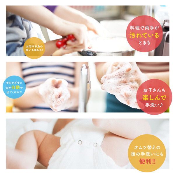 センサーが反応し。手洗い1回分(約1ml)がでます。ポンプを押す必要がないから衛生的に使えます。手洗いが楽しくなる3つの香りで展開!さらにボトルを使い切らなくても付け替えが可能!
