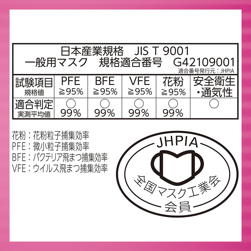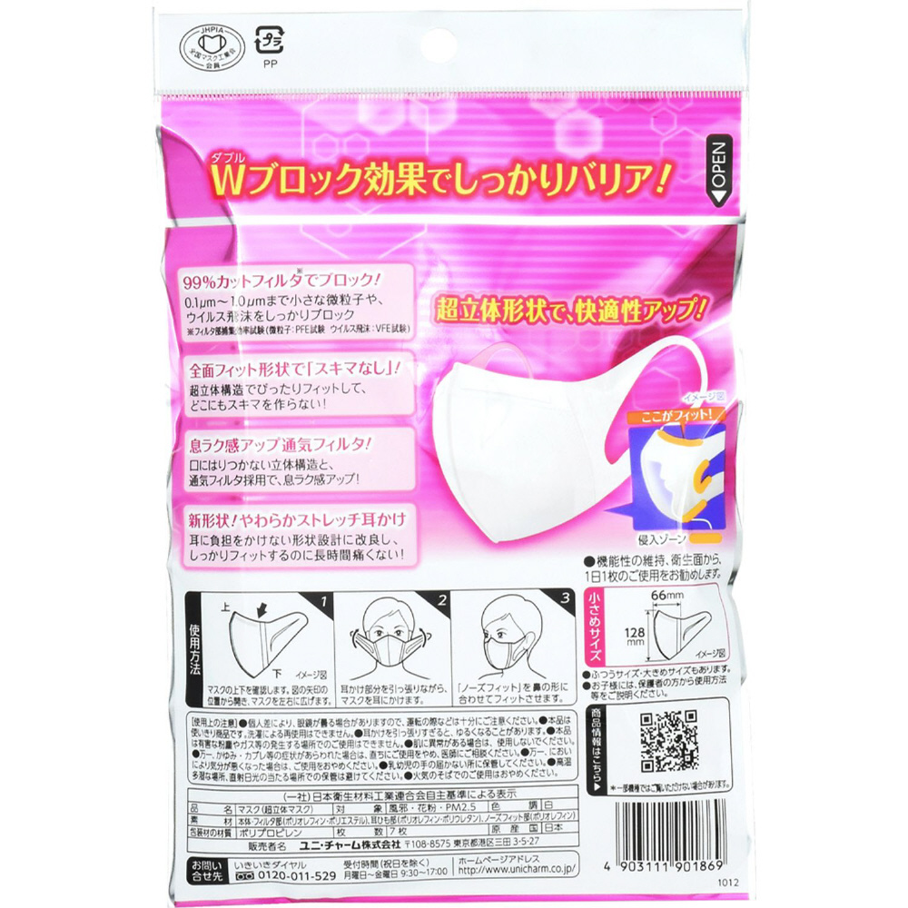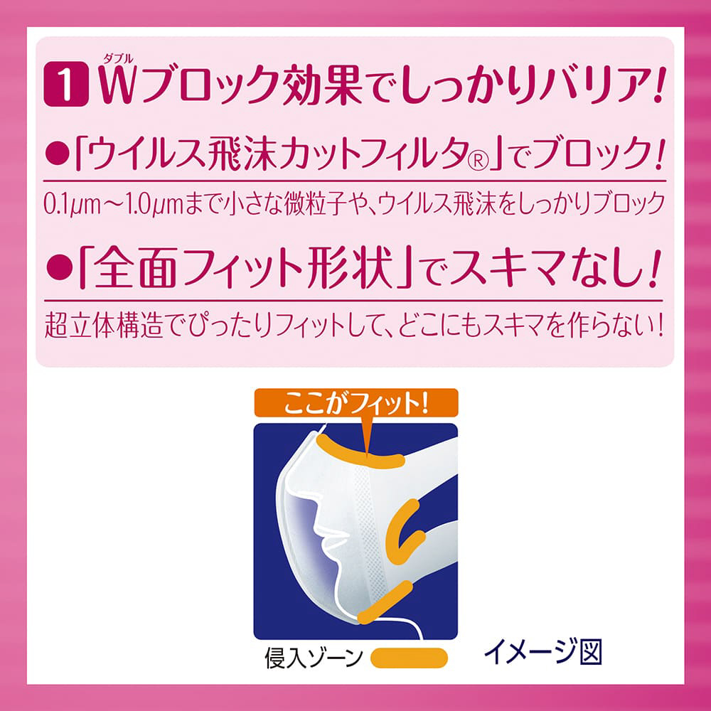 スキマを作らず、強力遮断!ノーズフィット搭載の超立体構造でぴったりフィットし、どこにもスキマを作りません。「息ラクフィルタ」と「口元空間」で、ぴったりフィットするのに呼吸が楽にできます。三層構造フィルタでウイルス飛沫・花粉・PM2.5をブロック。