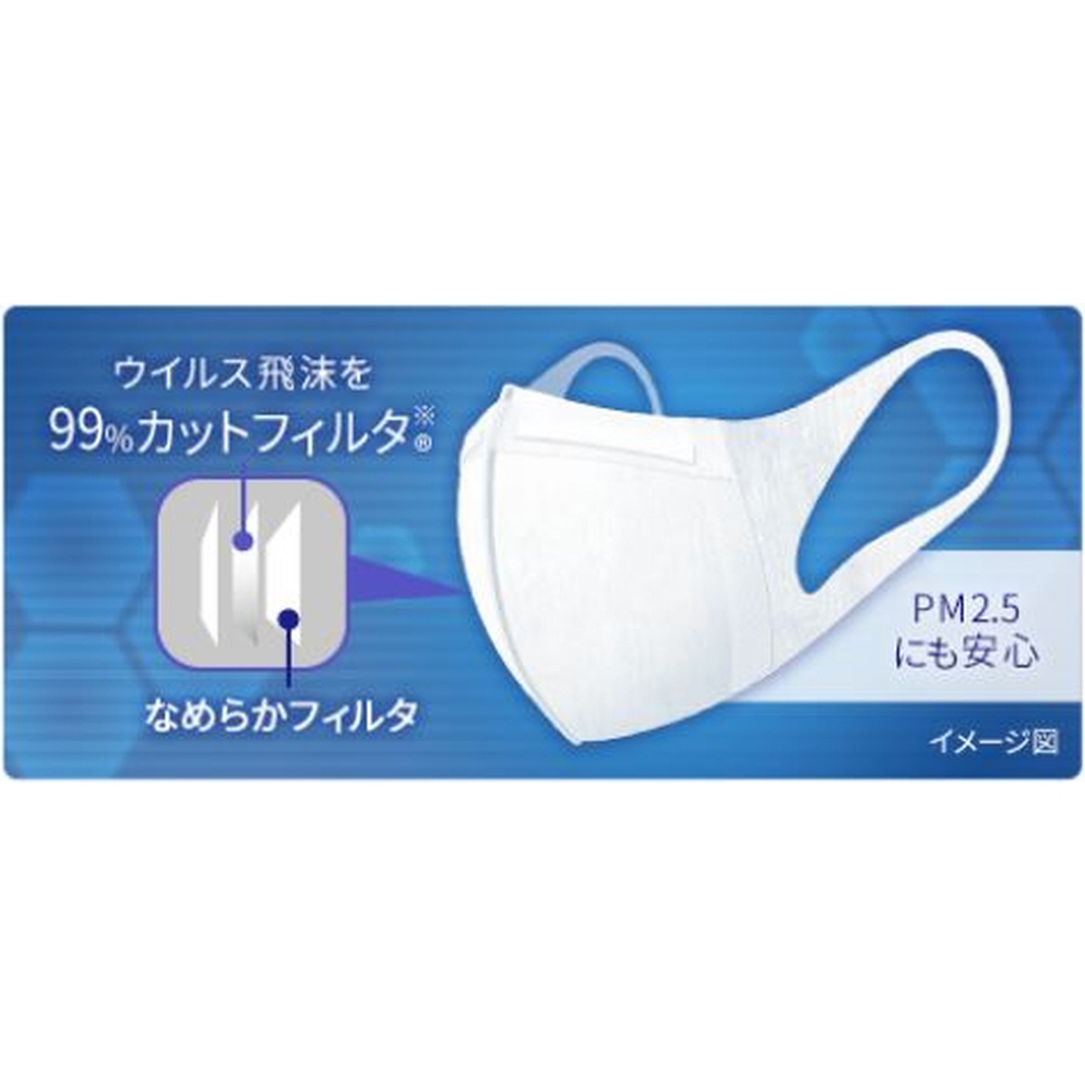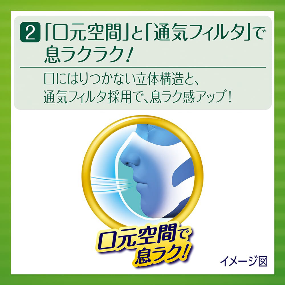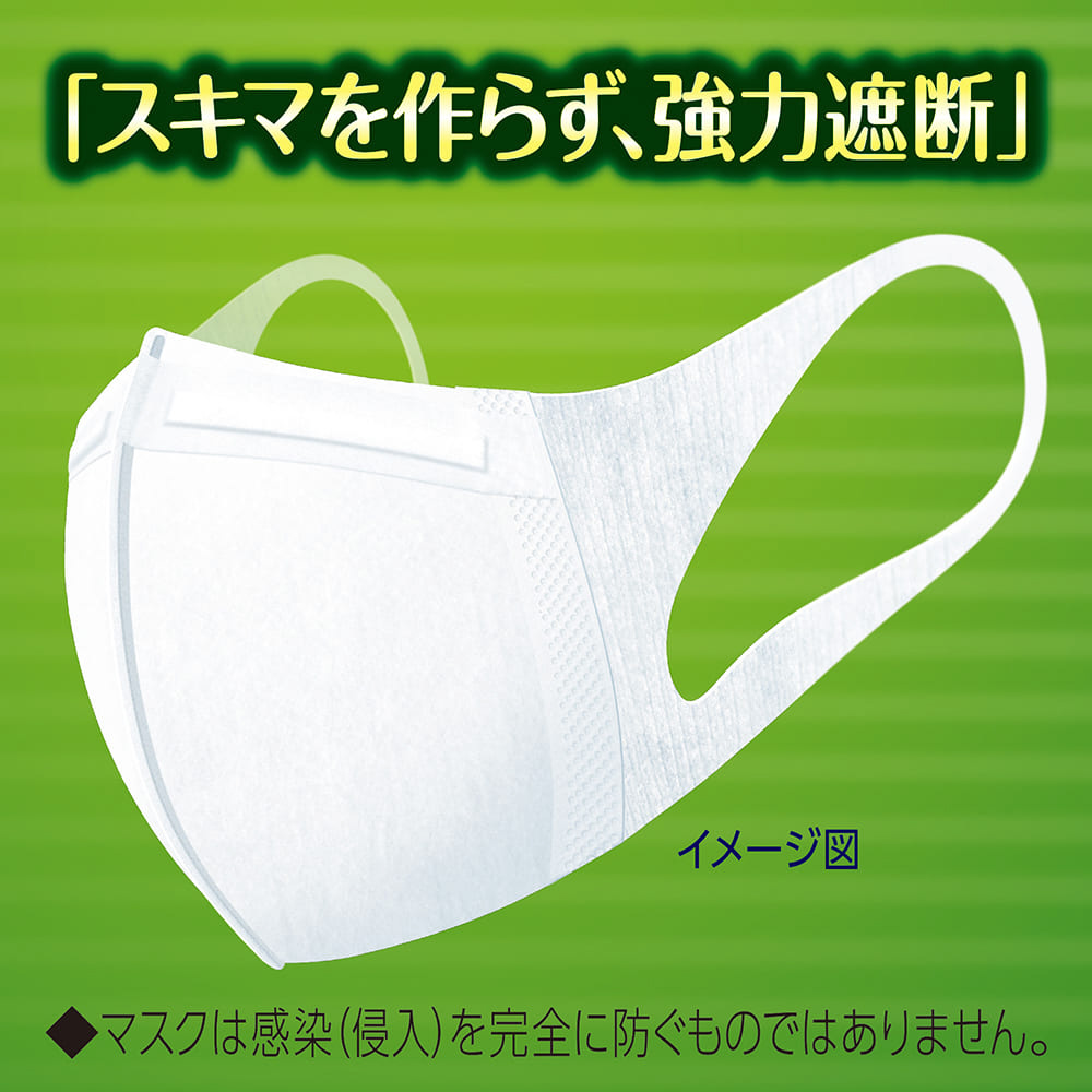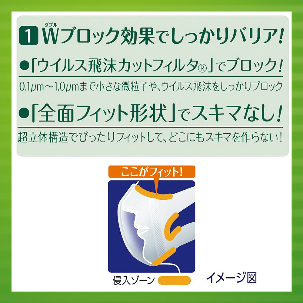 スキマを作らず、強力遮断!ノーズフィット搭載の超立体構造でぴったりフィットし、どこにもスキマを作りません。「息ラクフィルタ」と「口元空間」で、ぴったりフィットするのに呼吸が楽にできます。三層構造フィルタでウイルス飛沫・花粉・PM2.5をブロック。