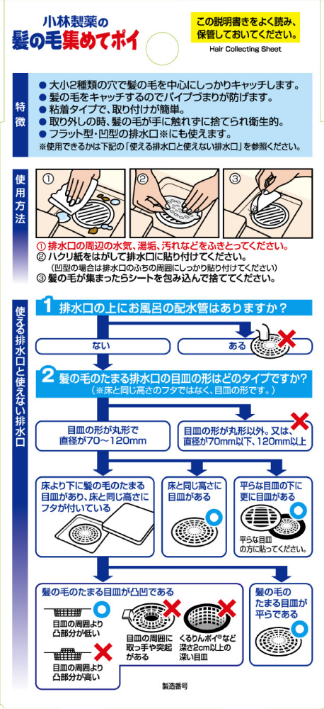 ●大小2種類の穴で髪の毛を中心でしっかりキャッチ●髪の毛をキャッチするのでパイプづまりが防げます●粘着タイプで取り付けが簡単●取り外しの時、髪の毛が手に触れずに捨てられるので衛生的です