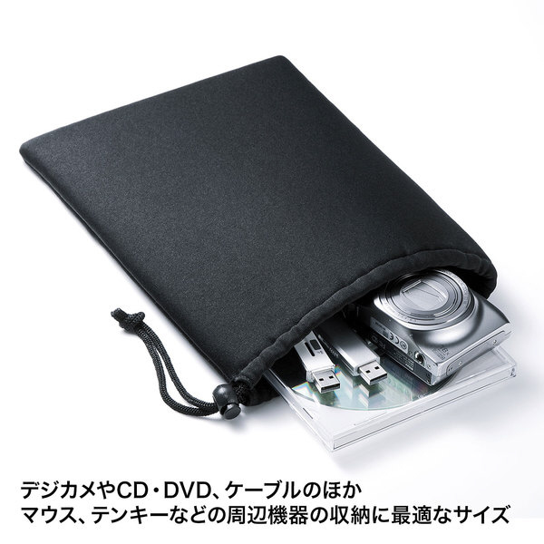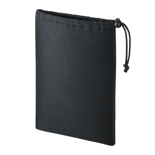 様々な用途に大活躍、機器を優しく保護するマルチクッションケース。巾着タイプ・ブラック。