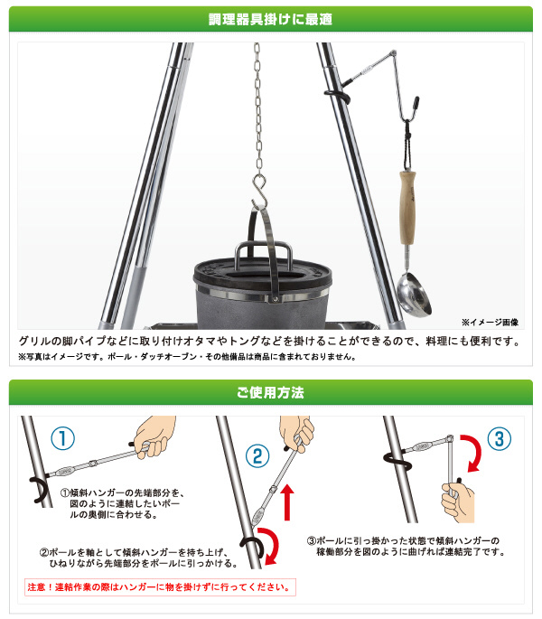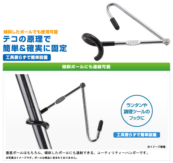 テコの原理で簡単&確実に固定!傾斜ポールにも連結可能なハンガー。