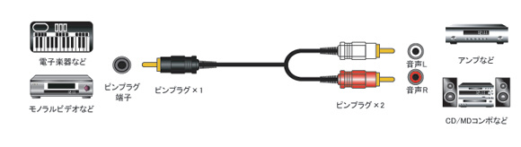 モノラルビデオデッキ・電子楽器等のモノラル音声をアンプ・ミニコンポ等のステレオ音声に接続して録音・再生する場合に使用するケーブルです。